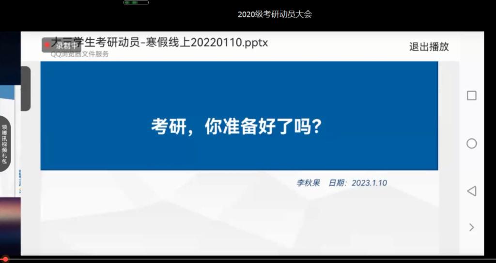 (通讯员:李韵王陈)为加强学院学风建设,提升大三学生对于考研的认知,更早的确定考研目标,明晰考研计划、充实假期生活。2022年1月10日下午3:00,化工学院通过腾讯会议开展线上2024届考研动员大会,出席本次会议的有学院党委副书记李秋果、辅导员王陈,本次会议由辅导员王陈主持,学院2020级全体本科生参加。