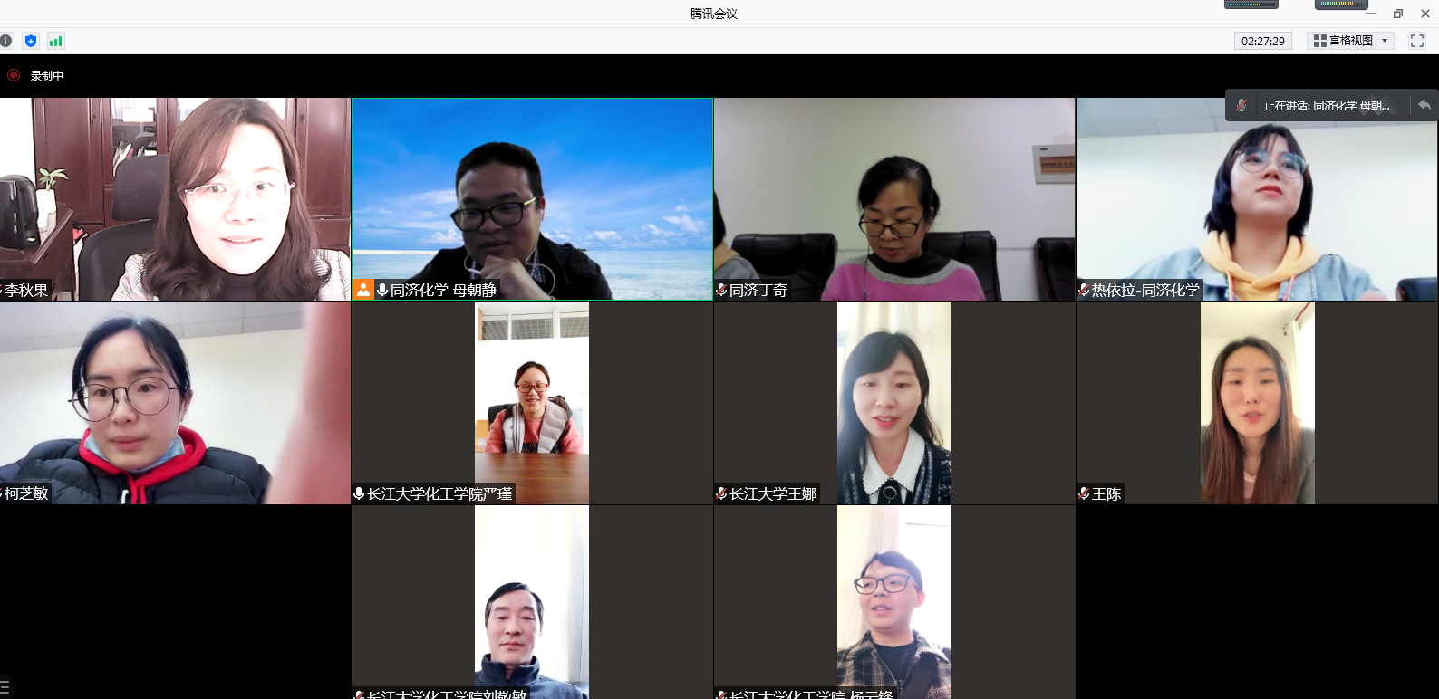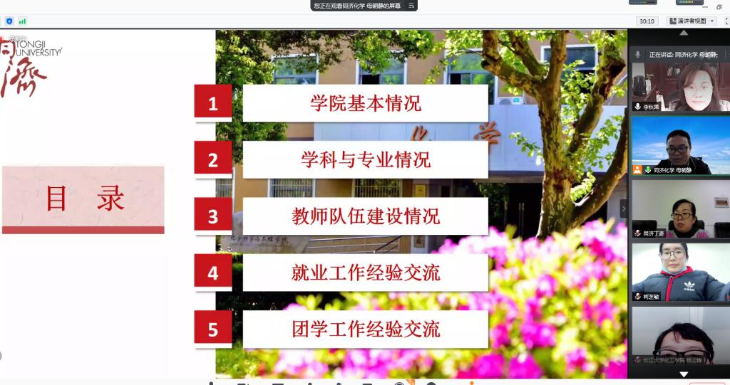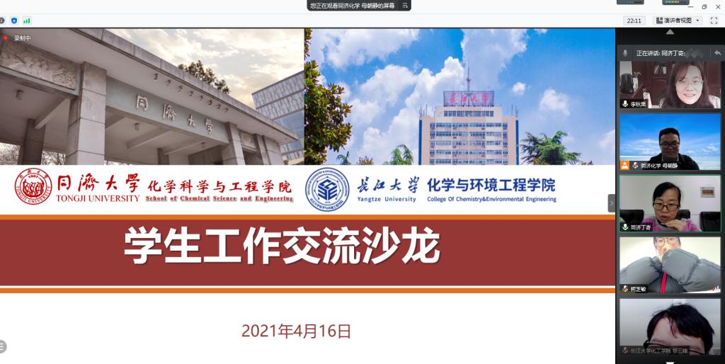 (通讯员 王娜)4月16日13:00,化工学院与同济大学化学科学与工程学院以视频方式开展学生工作交流沙龙,两院分管学工的党委副书记、全体辅导员参加会议,本次交流活动由同济大学化学科学与工程学院母朝静书记主持。