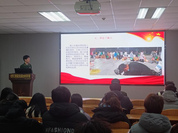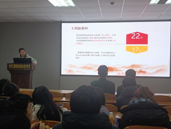 (通讯员 龙怡 聂琳珊)为做好2024年春季征兵宣传工作,帮助大学生了解、掌握应征入伍政策,激发学生参军入伍热情,12月21日晚七点,化工学院于14教北201举行征兵宣讲活动。本次活动由辅导员周学素老师主持。