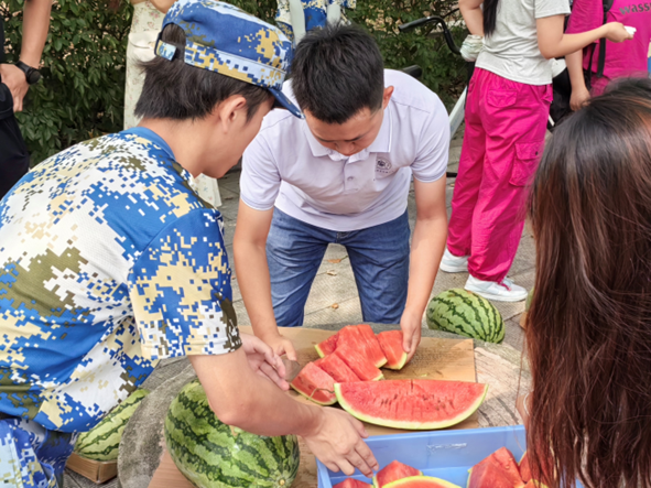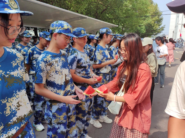 在欢声笑语中,老师和同学们将切好的西瓜一一分发给军训同学和辛勤的教官们,带来学院的祝福和慰问,让他们深切感受到化工学院大家庭的温暖和热情。