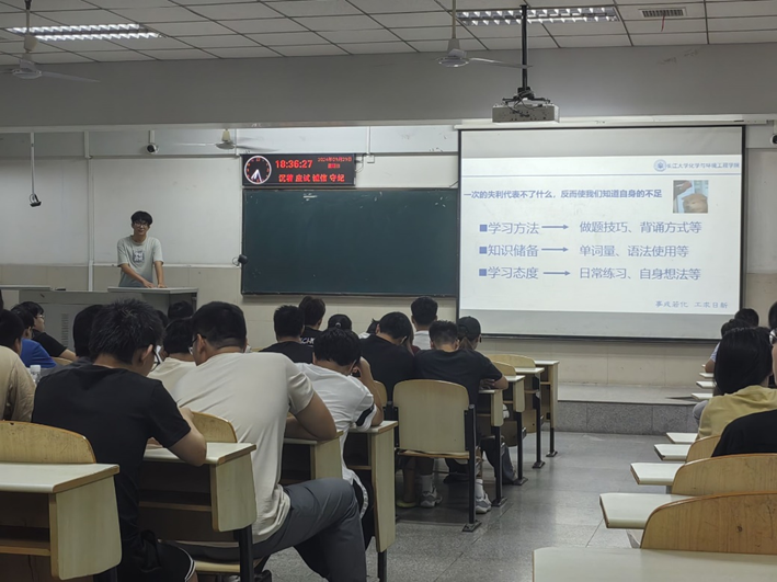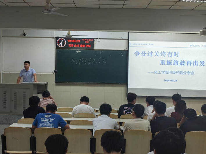 (通讯员 马鸣丽)为了进一步提升中高年级学生英语四级通过率,督促学生积极备考,化学与环境工程学院于2024年9月29日晚18:30,在12教105召开了四级经验分享会。党委副书记杨会军,辅导员王娜,以及21、22、23级四级未通过的学生参加大会。