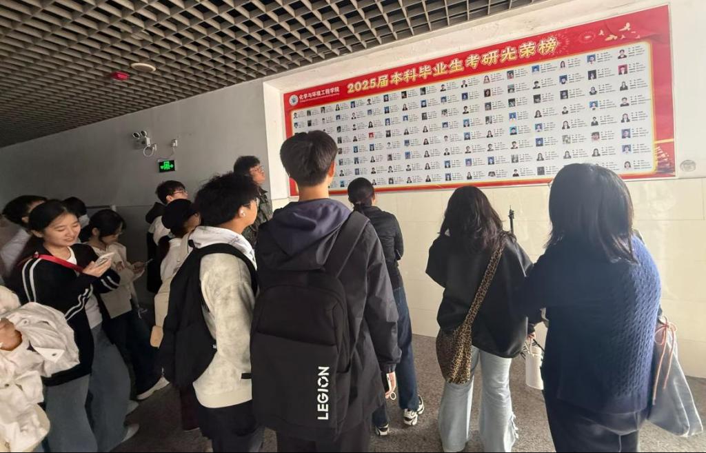 在化学与环境工程学院教学楼内的文化墙前,新生们驻足聆听讲解。文化墙以“事成若化 工求日新”为主题,系统呈现了化学学科的基本概念和发展脉络,展示了历届诺贝尔化学奖得主的科研事迹,让新生们直观感受化学学科的深厚底蕴与科研魅力。