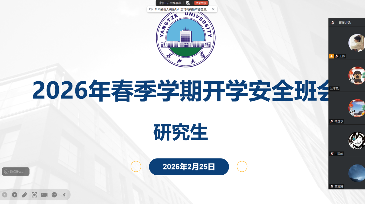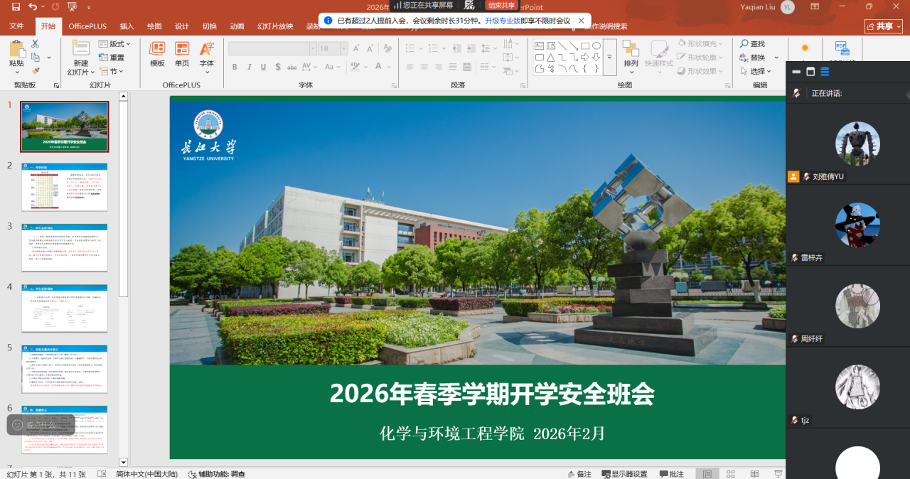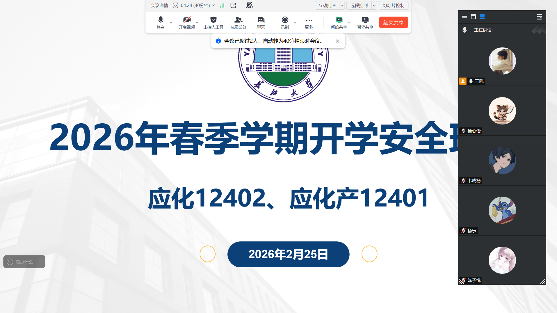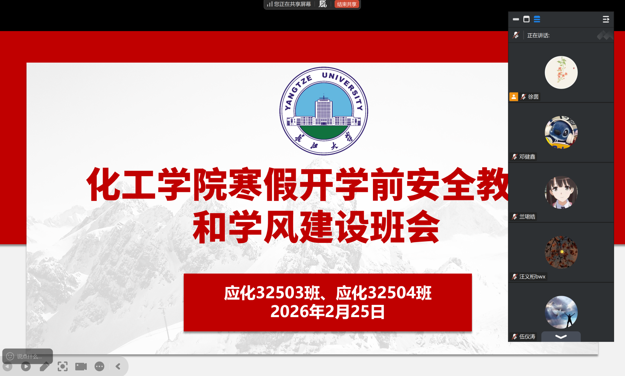 (通讯员 王陈)为全面落实学校开学工作部署,切实强化学生安全防范意识,引导学生明确新学期奋斗目标,扎实推进学生教育管理工作开好局、起好步,2月22日至2月26日,化学与环境工程学院组织本科生、研究生各班级,通过线上会议形式陆续召开2026年春季学期开学主题班会。