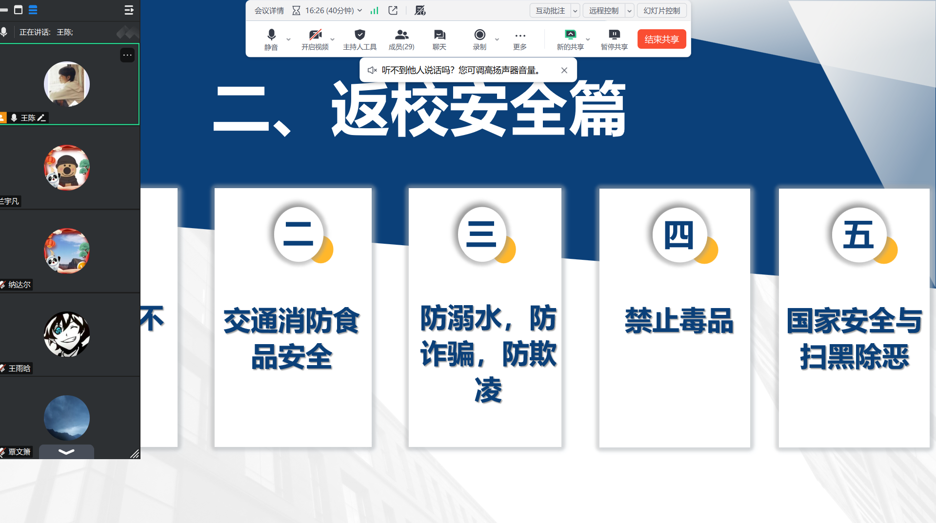 本次班会紧扣安全教育、学业指导、就业规划三大核心内容,内容充实、针对性强。在安全教育环节,各班围绕防电信诈骗、消防安全、交通安全、网络安全等重点领域,结合典型案例深入讲解,提醒学生认清各类安全风险,提高警惕性与辨别能力,自觉遵守安全规定,筑牢个人安全防护屏障,守护自身生命财产安全。