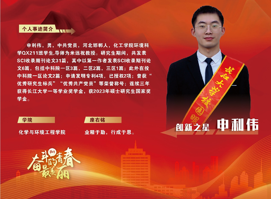进入大学以来,申利伟始终把专业学习放在首位,他知道,只有牢固的专业知识才是今后工作的根本。在本科期间必修平均绩点4.09,名列专业第一,多次获得国家励志奖学金、三好学生等荣誉称号。在学习书本知识的同时,他还积极加入学院老师实验室,在导师和学长的帮助下开展大创项目,并获得了湖北省大学生化学化工学术报告会二等奖。大四时以专业第一保研至本校继续攻读硕士研究生,目前顺利通过了四六级考试,并连续三年获得了长江大学一等学业奖学金,获2023年硕士研究生国家奖学金,荣获“优秀研究生标兵”、“优秀共产党员”等称号。