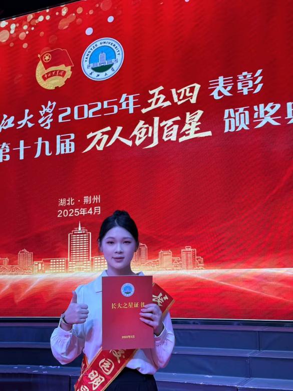 根系乡土,反哺桑梓情深。假期永远是她的公益档期”。随长江大学暑期三下乡”团队深入洪湖乡村,获中国网等主流媒体报道;在安岳县寒假返家乡”实践中,她积极宣传电瓶车充电安全事项检查九小场所消防安全;作为荆州火车站五一”假期志愿者组长,她带领的小组圆满完成任务并获得负责人表扬和感谢。因表现突出,相继获评长江大学诚信友善先进典型”、荆州马拉松优秀志愿者”、第十九届万人创百星向上向善之星”称号。