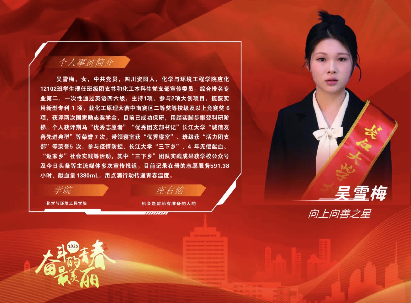 【个人简介】吴雪梅,女,汉族,中共党员,四川资阳人,长江大学化学与环境工程学院应化12102班学生。现任班级团支部书记和化工本科生党支部宣传委员。