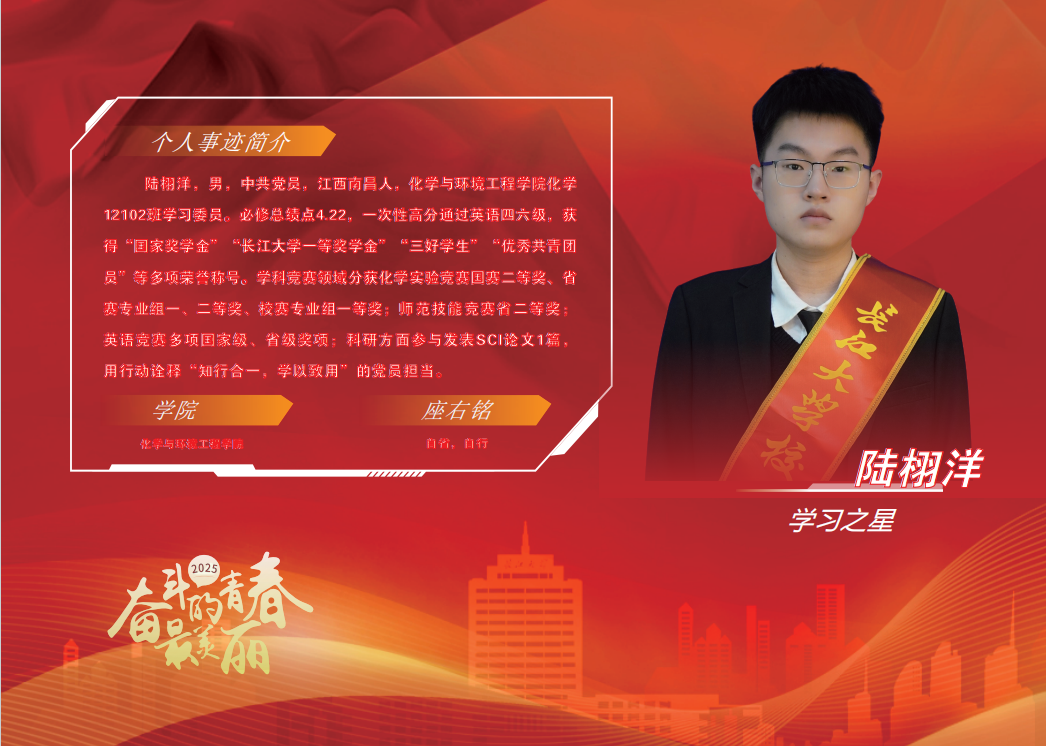 【个人简介】陆栩洋,男,汉族,中共党员,江西南昌人,长江大学化学与环境工程学院化学12102班学生,担任班级学习委员。