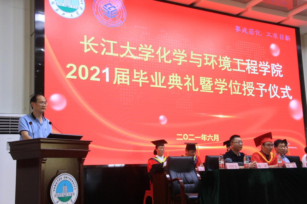 “起来,不愿做奴隶的人们”,毕业典礼在全体师生饱满热情的国歌声中拉开帷幕。随后,院长颜学敏发表致辞。颜院长说到,四年时光已然划过,他很欣慰见证了同学们最青春的成长过程,同学们也很荣幸地见证了学院的快速发展。在即将离别之际,他以“三心”之语与君共勉:希望同学们在未来的人生旅途能以本真之心入世、以赤子之心报国、以求索之心立业,母校将永远与大家同在!紧接着,教师代表尹先清教授分享了自己的所感与寄语,回首四年有苦有乐、所幸皆有所得,愿未来大家可以前途似锦,再创辉煌。优秀毕业生代化工11702班表裴欣雅通过自身经历,讲述了一名化工学子的 “长大”故事,她感谢母校的培养,丰富的教学资源给了她无限的自信,她号召2021届毕业生砥砺奋斗,握紧历史接力棒,跑出属于我们这一代的光荣和担当。随后,党委书记刘桂生作总结发言,他罗列了2021届毕业生取得的累累硕果以及学院近年来的重大科研、教学成果突破,鼓励大家继续不懈奋斗,欢迎同学们常回家看看。
