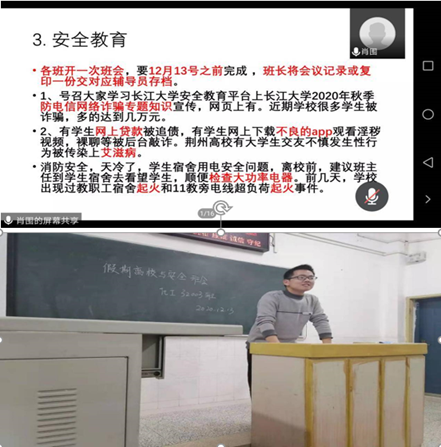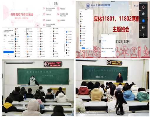12月13日前,为强调常态化新冠肺炎疫情防控、考试纪律以及寒假期间安全问题注意事项,化工学院各班级按照要求通过线上、线下的方式召开了期末安全教育班会。