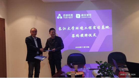 经过充分的交流与协商,学院院长颜学敏和荆州浦华荆清水务有限公司总经理肖建平签订了环境工程专业校外实习实践基地共建协议,长江大学实验室与国有资产处副处长彭礼进颁发了“长江大学教学实习基地”牌,化工学院教学副院长吴爱斌颁发了实习指导教师聘书。
