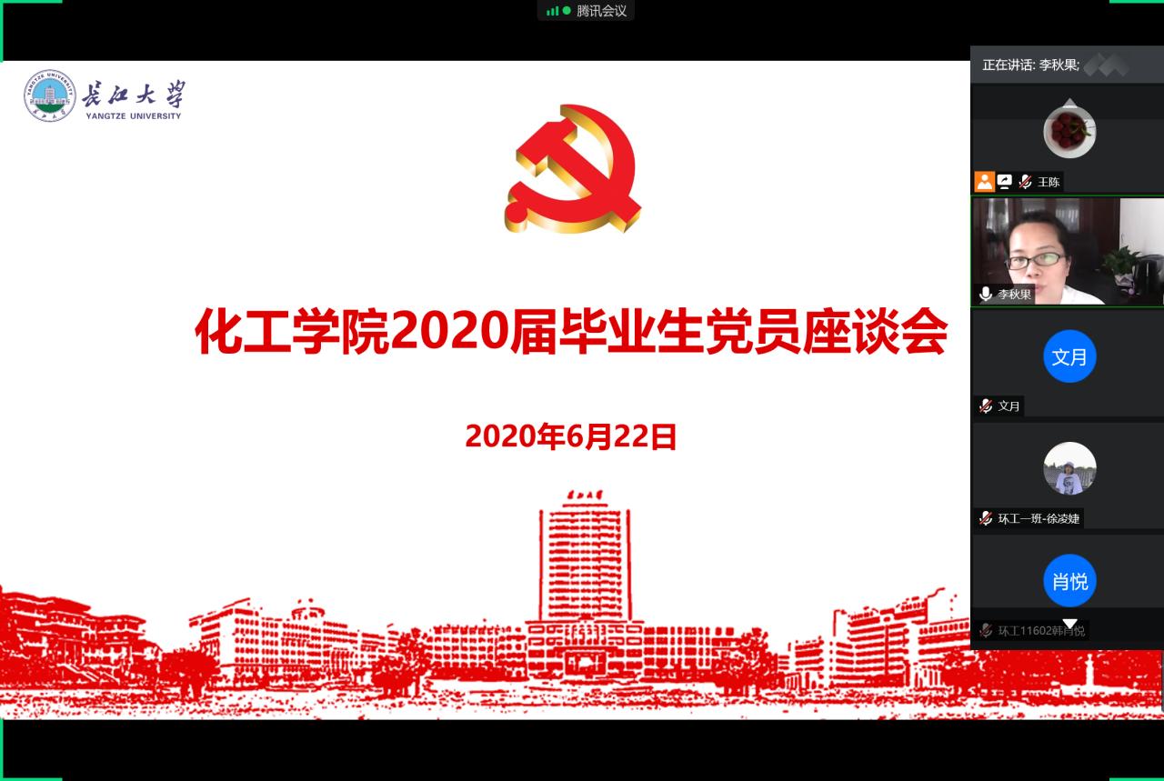 (通讯员 郭先哲 王陈)“不忘铮铮誓言,牢记初心使命”, 6月22日下午,化学与环境工程学院党委于腾讯会议召开2020届毕业生党员线上座谈会。学院党委书记刘桂生,副书记李秋果,党委委员、副院长黄河,党委委员、化工系主任石东坡,全体学生党支部书记及47名毕业生党员参加座谈。化工学院党委副书记、本科生第一党支部书记李秋果同志主持会议。