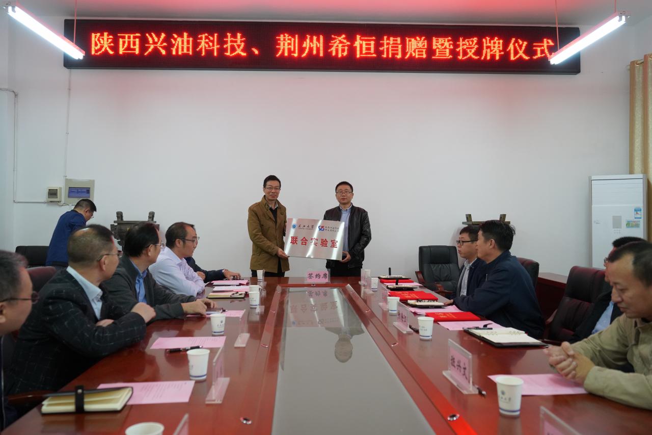10月16日上午,陕西兴油科技开发有限公司、荆州市希恒建设工程有限公司捐赠暨授牌仪式在学院303会议室举行。陕西兴油科技开发有限公司董事长兼总经理王治贤、荆州市希恒建设工程有限公司总经理班兴文、长江大学教育发展基金会副理事长兼秘书长孙启军、研究生院副院长曾威、学院院长颜学敏、党委书记刘桂生、校企双方有关方面负责人和教师代表等出席捐赠仪式。