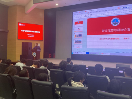 (通讯员 王欣蕊 伍吉玥)文化是民族的血脉,是人民的精神家园。为增进文化认同,坚定文化自信,促使新生加强对楚文化的了解,化学与环境工程学院于2024年11月7日下午在农科大楼1058号学术报告厅开展了化工学院化雨讲坛2024年第二讲——楚文化的内涵与价值讲座。此次讲座由人文与新媒体学院副院长、李征宇教授主讲,学院党委副书记杨会军主持,2024级全体本科生参加。