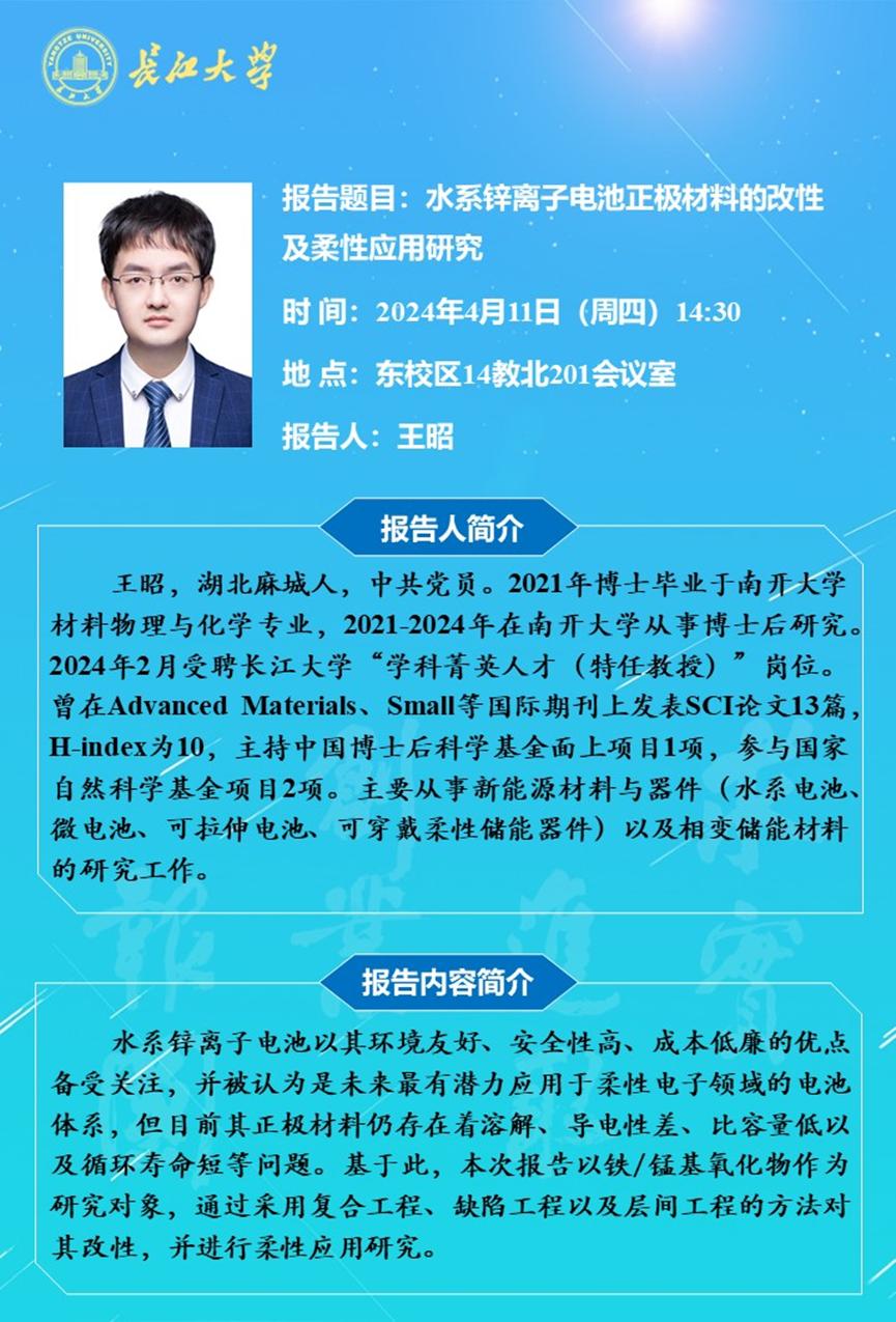 长江化工讲坛:水系锌离子电池正极材料的改性及柔性应用研究