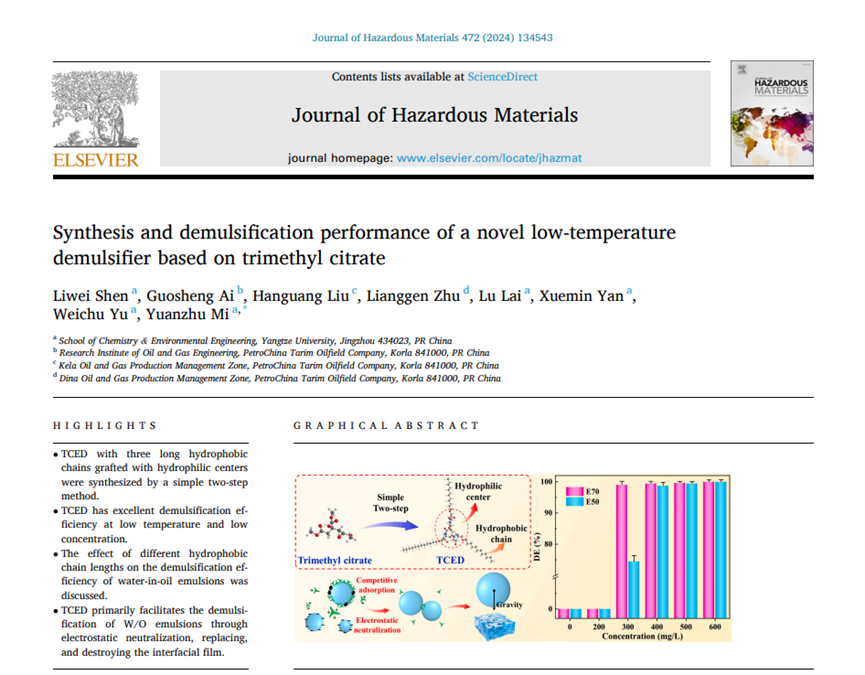 最近,《Journal of Hazardous Materials》(IF=13.6)发表了化学与环境工程学院米远祝教授课题组的最新研究成果,报道了一种低温原油破乳剂的制备。论文题目为“Synthesis and demulsification performance of a novel low-temperature demulsifier based on trimethyl citrate”,硕士研究生申利伟为论文第一作者,米远祝教授为论文通讯作者。