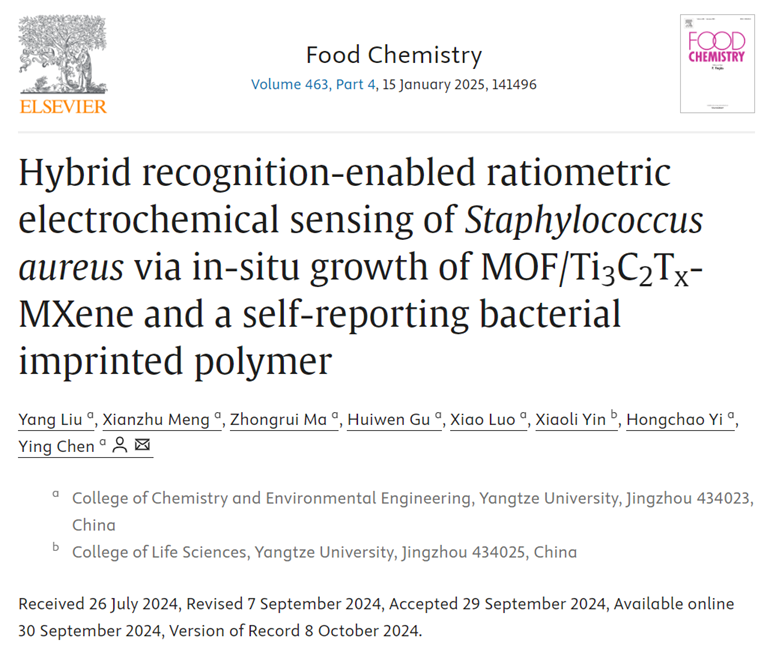 近日,长江大学化学与环境工程学院陈颖教授课题组在食源性致病菌的检测方面取得重要研究进展,相关研究成果以题为“Hybrid recognition-enabled ratiometric electrochemical sensing of Staphylococcusaureus via in-situ growth of MOF/Ti3C2TX-MXene and a self-reporting bacterial imprinted polymer”的学术论文发表于食品科学领域国际著名期刊Food Chemistry(IF=8.5,中科院一区Top期刊)上。长江大学化工学院硕士研究生刘洋为论文第一作者,陈颖教授为论文通讯作者。该研究受国家自然科学基金(21605007)和湖北省自然科学基金(2023AFB906)项目的资助。