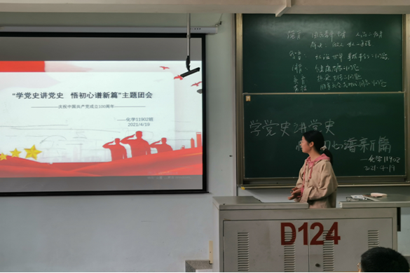 为响应党的号召,根据化工院发〔2021〕6号文件,学院于2021年4月23日下午在2教103举行以“学党史讲党史 悟初心谱新篇”为主题的团会。此次活动由化工学院分团委学生会组织部部长罗迎新主持,并且邀请到了李秋果副书记、严谨老师来为大家进行讲解。在此次活动中,不仅让学生们深入学习领会习近平关于党史的重要论述,学习了《中国共产党简史》,集中中开展了入团仪式,组织团员重温入团誓词,邀请优秀团干、优秀团员等分享交流成长体会。李秋果副书记带领大家学习:学“四史”——“学党史 强信念 学原著 悟思想”,联系时代特点和国情,结合学生成长的实际学习情况,带领大家学习党史,从党史中汲取面向未来的不竭动力。通过上述活动的开展,同学们更加坚信共产党领导的优越性,更加了解党,更加热爱党。